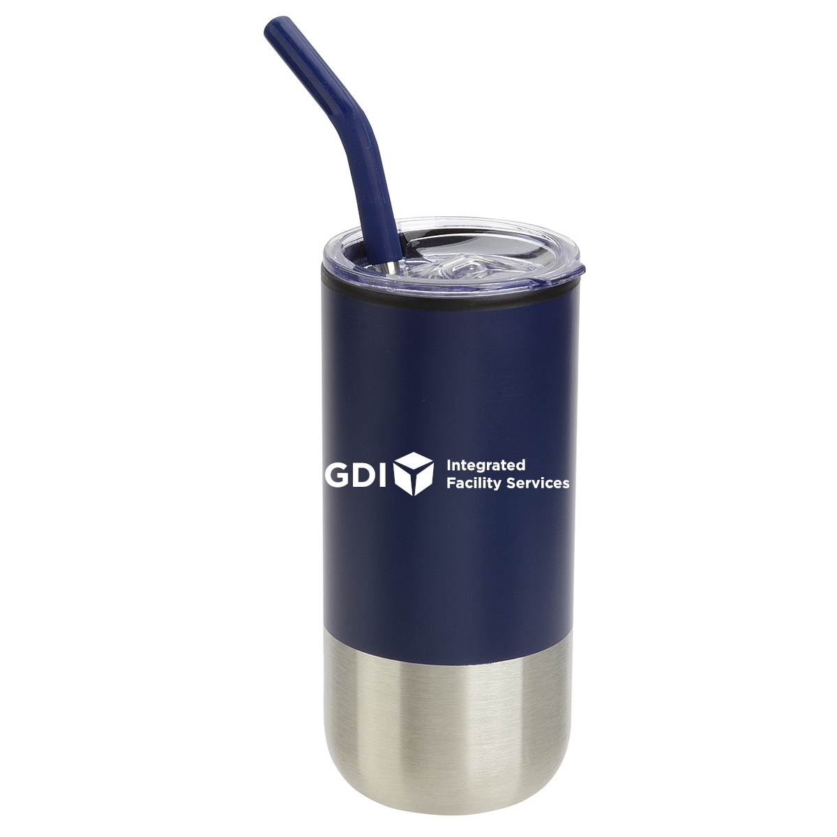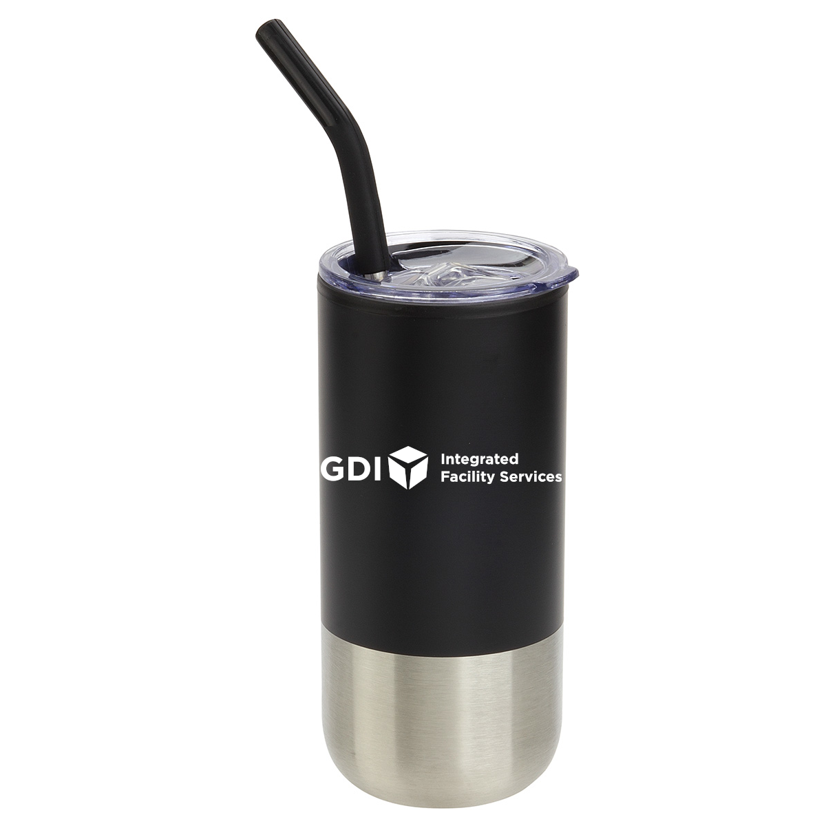 Oxford 16 oz Stainless Steel/Polypropylene Tumbler with Straw has a stainless steel outer shell with black polypropylene inner lining that keeps beverages hot or cold for up to 3 hours. Tumbler comes with a metal straw and color matched silicone straw sleeve that is is food-grade.Wide-mouth lid is 100% BPA-free acrylic. Hand wash only. FDA certified.