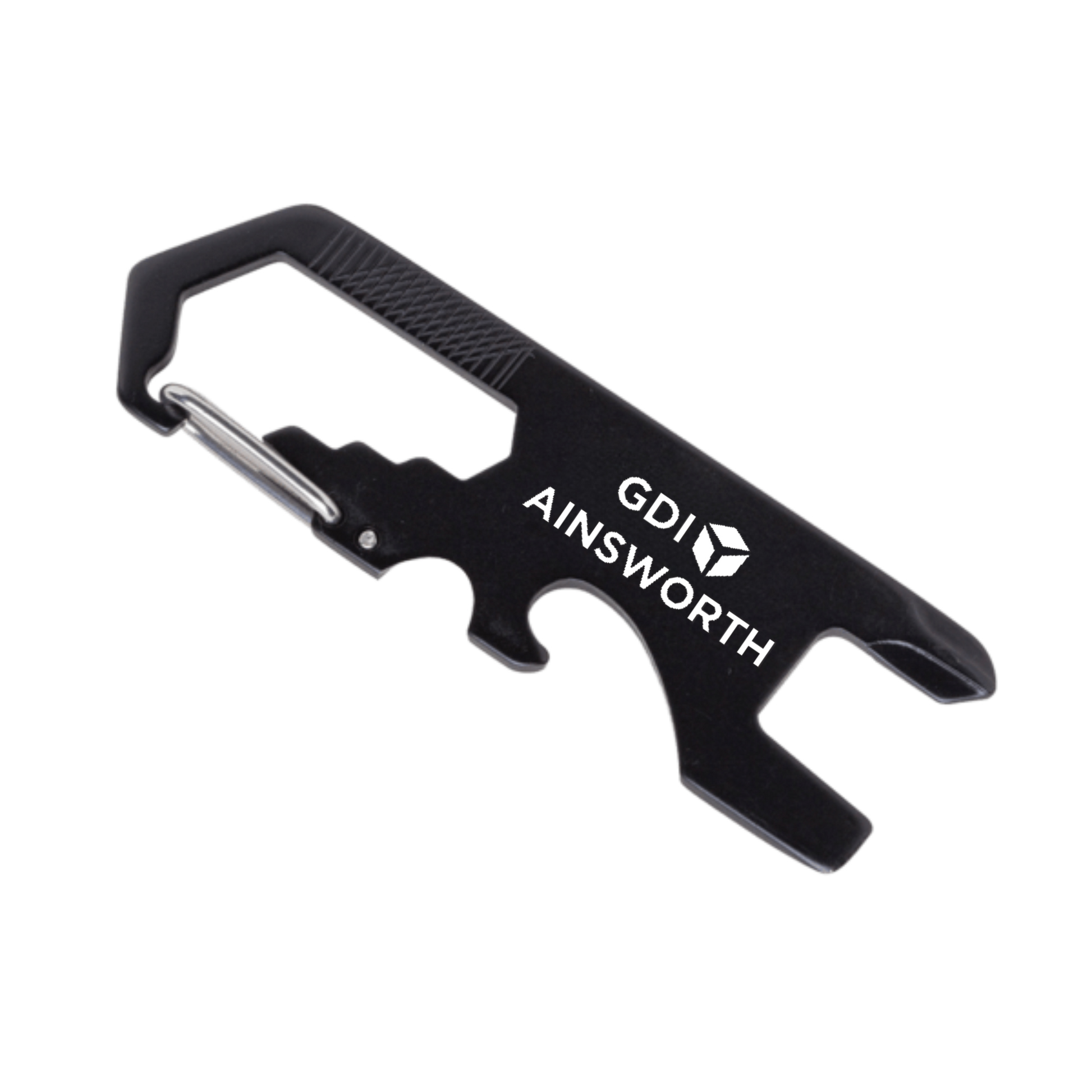 Stay close to new and potential customers when you advertise your brand with this carabiner tool! Measuring 3 1/4" x 1", this 8-in-1 TSA friendly tool is made of stainless steel and includes a nylon sheath with belt loop. The implements include a flat and Phillips screwdriver, bottle opener, ruler, wrench, file, cutter and carabiner clip.