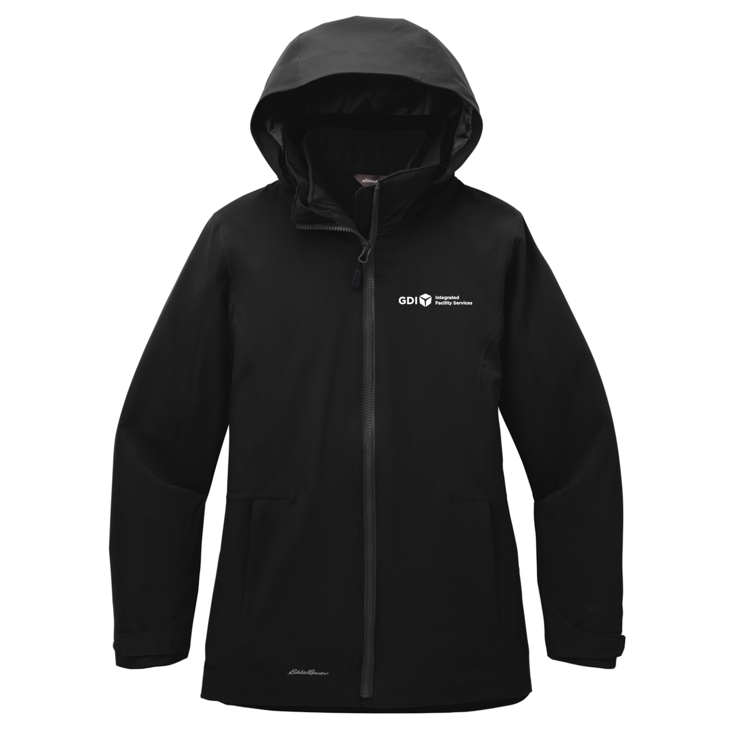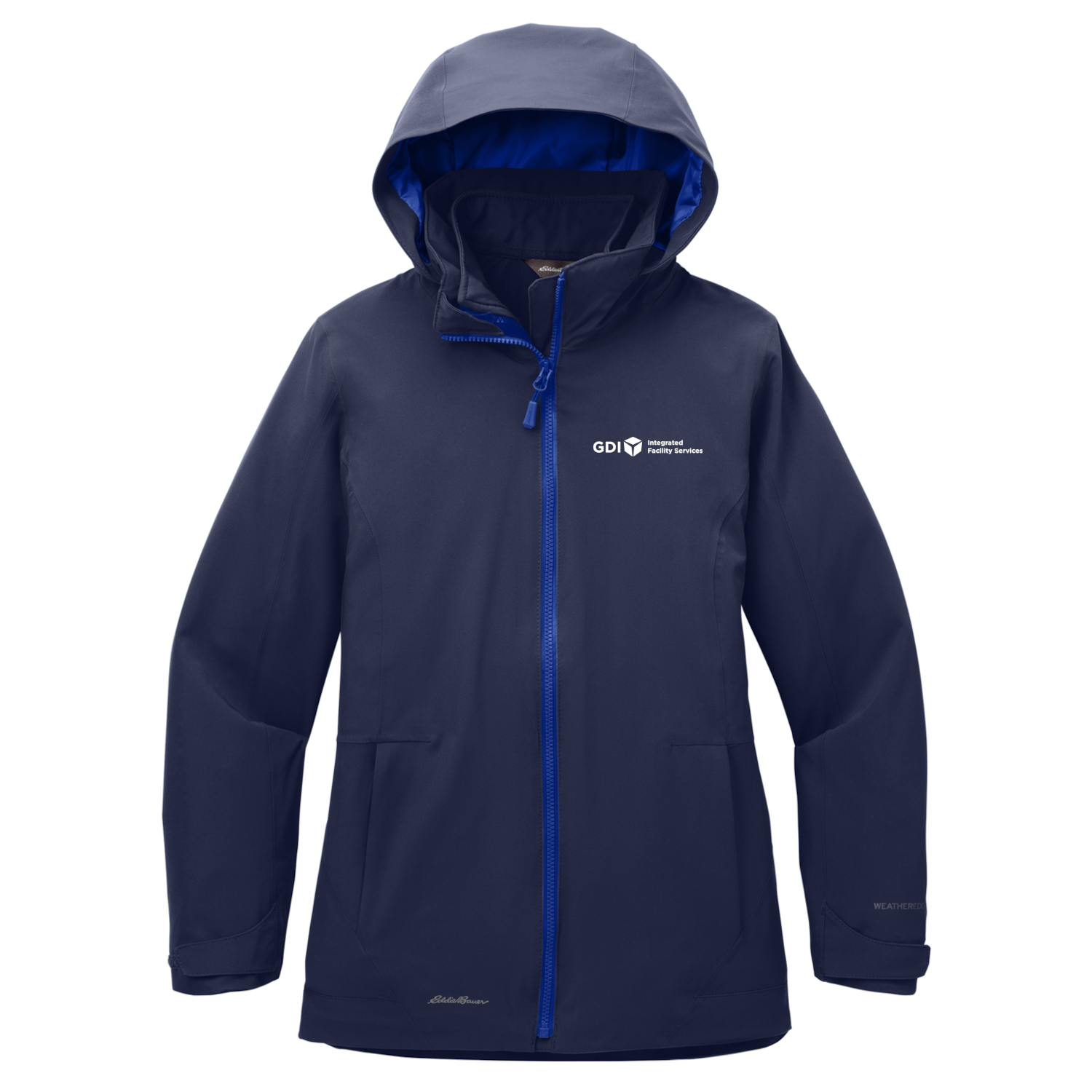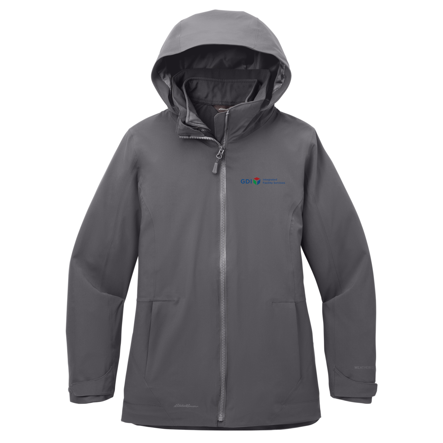 Engineered for complete adaptability to weather conditions on and off the mountain, this versatile 3-in-1 system jacket has a fully seam-sealed shell engineered from waterproof and breathable 5K/5K fabric and an inner soft shell jacket. Exclusive WeatherEdge and StormRepel® durable water-repellent technology offer unparalleled weather protection, while four-way stretch gives easy mobility. The waterproof shell and soft shell inner jacket can be worn separately or combined to meet a vast array of weather conditions. Adjustable hood with locking drawcord, full-length interior storm flap. Molded center front zippers (Shell has a waterproof zipper.) Zippered pockets. Adjustable tab cuffs with hook and loop closures. Adjustable locking drawcord hem. Decoration access pocket in shell. Contrast WeatherEdge heat transfer logo on left sleeve. Contrast Eddie Bauer heat transfer logo on right hem. Shell made of 94/6 polyester/spandex with durable water-repellent (DWR) finish, PU laminate and 100% polyester lining. Inner jacket made of 100% polyester with a DWR finish bonded to a water-resistant film insert and 100% polyester microfleece lining.