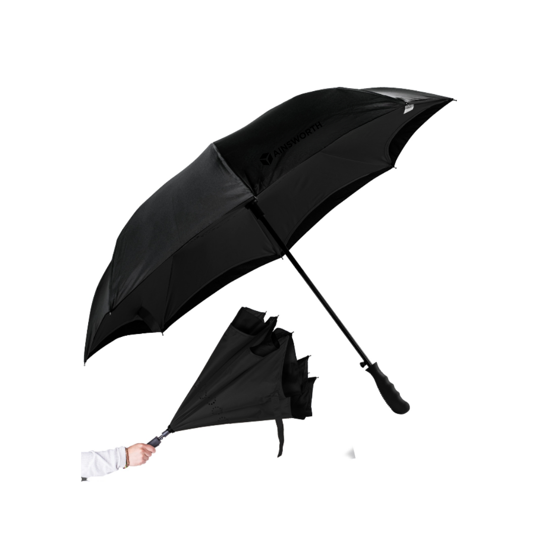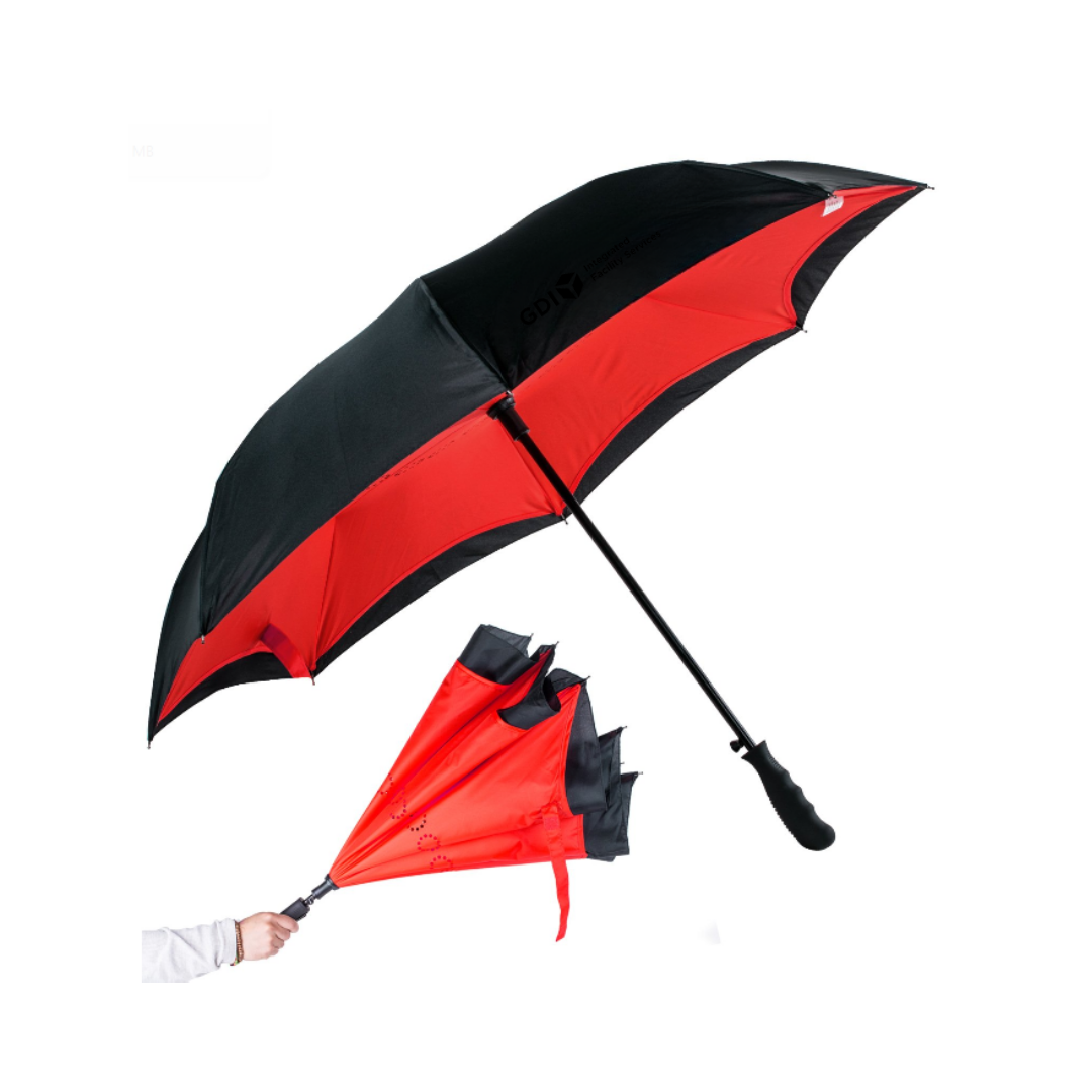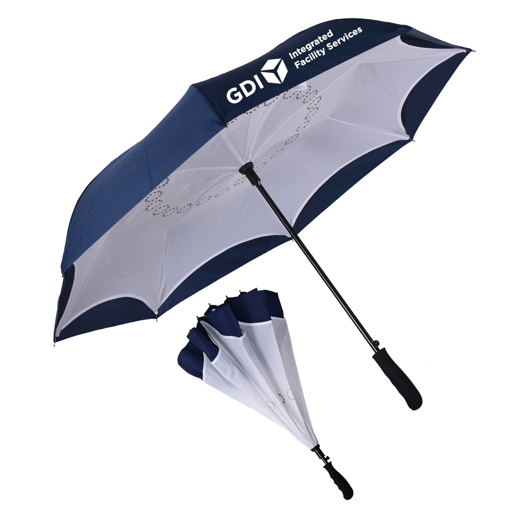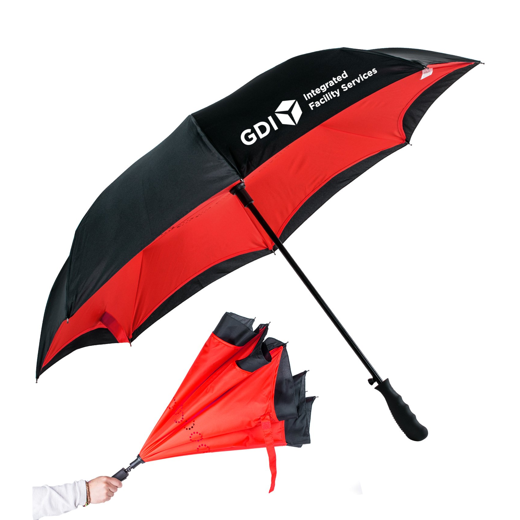 This umbrella will not only protect you from the rain, but also from a rain-soaked umbrella! The Rebel umbrella is an inverted umbrella, revolutionary designed to keep you dry when closing. The unique feature allows the water to push away when closing, making it easy when entering or leaving a car or through a door. Features include a 48" arc, manual open and auto close, making it that much easier for getting through a door, pongee fabric and a straight rubberized finger grip handle. Offered in a variety of color combinations with color contrasting options. It's been 300+ years; it's time to change things up!